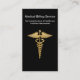 Medical billing business cards with gold coloured medical symbol and text layout you can customize on both sides of this smart two side business card that includes two side printing. Change the background colour and add your own touches to make this business card template work for you.