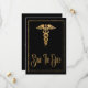 Faux gold styling with blue background creates a classic modern graduation save the date card. Perfect for graduates finishing their studies at medical school, earning their nursing degree, pinning ceremony and professionals in the medical industry. Nursing or Doctor graduation save the date includes a faux gold caduceus symbol along with a graduation cap. Send a graduation save the date card to your family and friends. Blue background color can be changed to color of your choice.