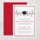 This heartbeat-themed graduation invitation features a bold and modern design with striking red accents. A sleek double-line frame in red outlines the edges, adding a refined touch. The EKG heartbeat line in the centre is complemented by a graduation cap displaying "Class of," with the graduation year below, making it a meaningful choice for celebrating a medical or nursing school graduate. A mix of black and red serif and modern typography enhances the stylish and contemporary look.
