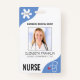 Medical employee photo badge with a stethoscope and heart design. Sample shows NURSE title but can be edited for any staff position. Include a logo or delete the sample image. BACKGROUND COLOR CHANGE: The blue background colour can be changed by clicking on the CUSTOMIZE FURTHER tab. Contact the designer if you would like this design modified or need assistance with colour.