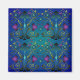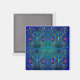 Lovely medieval floral pattern square magnet, purple, green, blue on midnight blue background.