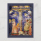 Medieval Good Friday scene with Christ on the Cross surrounded by angels. Richly coloured in blues, golden yellows and orange.