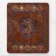 Image of medieval leather book cover with a rampant lion within the shape of a shield.