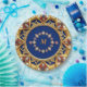 Golden ornament featuring vibrant gemstones and a formal blue layout. Its medieval decorative style exemplifies elegance and sophisticated design, ideal for themes of luxury, antiquity, or artistic inspiration.