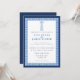 An elegant wedding invitation featuring a Greek key frame and a Greek column in cool Aegean / Mediterranean colours.
