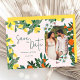 Announce your special day with this elegant Mediterranean-inspired Save the Date design. Featuring hand-painted lemons, oranges, olive leaves, and delicate blossoms, this artwork captures the charm of a sunny Italian or coastal destination wedding. The soft romantic colour palette and modern script typography create a stylish and timeless look, while the photo space allows couples to personalize the card with their favourite engagement picture. Perfect for Amalfi Coast, Italian, Greek, or citrus-themed weddings, this design beautifully sets the tone for a joyful celebration. Original artwork by Caroline Bonne Müller