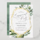 Beautiful nature theme engagement party invitations feature grey lettering framed by a gold foil geometric border and delicate watercolor illustrations of Mediterranean greenery, leaves, olives, and lemons. A modern choice in a natural colour scheme for boho or nature themed engagement celebrations.