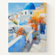 Step into a Mediterranean seaside village with this colourful paint-style design. The bright, white and blue buildings are surrounded by cheerful orange bougainvillaea flowers, adding pops of colour. This artwork is calming and serene which is the epitome of coastal living, perfect for anyone who loves that classic Mediterranean vibe.