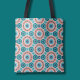 Carry the warmth of the Mediterranean with this tote bag featuring a bold geometric pattern in peach, teal, pale aqua, and petrol blue. Perfect for those who love summer vibes and striking designs.