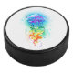 Grande méduse irisée, artistiquement dessinée, brillante, avec de longues tentacules sur le blanc, peinte sur l'arrière - plan multicolore. Méduse arc-en-ciel.