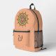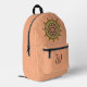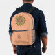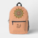 This gold and pink mandala was inspired by Indian mehndi and costumes from Japanese anime. It features layers with lotus petals, leaves, paisley and an ornamental wheel around it all. Customize the initial on the front pouch of this backpack with your own monogram to make this accessory uniquely yours.