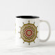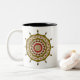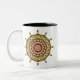 Ce design de cercle concentrique doré et rose a été inspiré par les médailles et les costumes indiens de dessins animés japonais. Il comporte des couches avec pétales de lotus, feuille, paisley et une roue ornementale autour de lui. D'autres couleurs et styles de tasses sont disponibles, y compris des tasses de voyage et des steins.