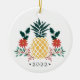 Festive holiday ornament features the Hawaiian Christmas greeting "Mele Kalikimaka" in red hand lettered typography, surrounded by red poinsettias, holly leaves and Christmas greenery. Customize the reverse side with the year for a sweet holiday keepsake, beneath a Christmas pineapple illustration flanked by matching poinsettia flowers and holly.