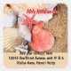 Mele Kalikimaka beach seashells and starfish return address stickers. Colourful starfish and sea shells rest in the sand. The coral coloured starfish lies next to various coloured shells, including the following: scallop, Florida cone, Conidae, cut ribbed ark shells, dwarf triton shell, and others. The photo is purchased from GraphicStock.