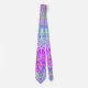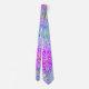 A tie with an elaborate decorative design of doodled white lines on a vibrant watercolor background in magenta, green, and blue.