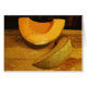 This note card features fine art photography of two slices of golden orange cantaloupe melons. They are so luscious, the juice can be seen on the wooden cutting board. The texture patterns of the green and yellow rinds against the gold and brown tone surface plus the wood wall behind create an interesting abstract composition of colour and form. The original photograph has been digitally enhanced to emphasize the overall mood of this impressionistic, artistic still life print.