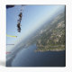 Members of the US Navy Parachute Team, the Leap Frogs, perform a bi-plane with their parachutes above Seattle featured with horizon over land.