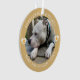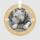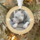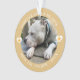 Ornement moderne élégant et tendance de souvenir de perte d'animal de compagnie, votre photo préférée dans un cadre rond, lettrage circulaire, coeurs d'accent décoratifs avec empreinte de patte en surimpression sur fond jaune poussiéreux.