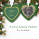 Ce magnifique ornement commémoratif met en scène votre photographie dans un cadre doré en forme de coeur. Le cadre est placé sur un arrière - plan de jolis flocons d'or sur le vert Holiday. Le dos de l'ornement a le même arrière - plan de flocon doré avec votre texte personnalisé en or sur un coeur vert solide.
