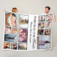 Personalized memorial fleece blanket featuring a simple white background that can be changed to any color, a 16 photo collage, the saying "forever in our hearts", and their name.
