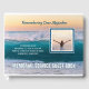 This design is meant for memorial services and other commemorative events for a dearly departed who enjoyed walking along the beach, surfing, beach combing, swimming, boating, sailing, diving, and other nautical or marine-related activities. The background image features a beautiful ocean landscape. Customize the sample text and replace the sample portrait with your own for a personalized design. Keep the background photo if you like, or replace with your favourite relevant snapshots.