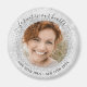A simple and elegant memorial photo magnet. A faux silver metallic looking background, a white frame, faux glitter sparkles. Personalize and add a photo and details. Black text: forever in our hearts.