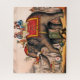 Vintage print of men performing a circus act with an elephant. One man is riding on the tusks, another is lying beneath the animal.