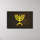 A digital rendering of the Jewish seven-branched menorah (Hebrew: מְנוֹרָה). Add your own text. The seven-branched menorah, used in the portable sanctuary set up by Moses in the wilderness and later in the Temple in Jerusalem, has been a symbol of Judaism since ancient times and is the emblem on the coat of arms of the modern state of Israel. The kohanim lit the menorah in the Sanctuary every evening and cleaned it out every morning, replacing the wicks and putting fresh olive oil into the cups. It has been said that the menorah is a symbol of the nation of Israel and our mission to be "a light unto the nations." (Isaiah 42:6). Our sages emphasize that light is not a violent force; Israel is to accomplish its mission by setting an example, not by using force. This idea is highlighted in the vision in Zechariah 4:1-6. Zechariah sees a menorah, and G-d explains: "Not by might, nor by power, but by My spirit." G-d revealed the design for the menorah to Moses as follows (Exodus 25:31-40): 31 And you must make a lampstand of pure gold. Of hammered work the lampstand is to be made. Its base, its branches, its cups, its knobs and its blossoms are to proceed out from it. 32 And six branches are running out from its sides, three branches of the lampstand from its one side and three branches of the lampstand from its other side. 33 Three cups shaped like flowers of almond are on the one set of branches, with knobs and blossoms alternating, and three cups shaped like flowers of almond on the other set of branches, with knobs and blossoms alternating. This is the way it is with the six branches running out from the lampstand. 34 And on the lampstand are four cups shaped like flowers of almond, with its knobs and its blossoms alternating. 35 And the knob under two branches is out of it and the knob under the two other branches is out of it and the knob under two more branches is out of it, for the six branches running out from the lampstand. 36 Their knobs and their branches are to proceed out from it. All of it is one piece of hammered work, of pure gold. 37 And you must make seven lamps for it; and the lamps must be lit up, and they must shine upon the area in front of it. 38 And its snuffers and its fire holders are of pure gold. 39 Of a talent of pure gold he should make it with all these utensils of it. 40 And see that you make them after their pattern that was shown to you in the mountain. Until 2009, the earliest preserved representation of the menorah of the Temple was depicted in a frieze on the Arch of Titus, commemorating his triumphal parade in Rome following the destruction of Jerusalem in the year 70. In 2009, however, the ruins of a synagogue with pottery dating from before the destruction of the Second Temple were discovered under land in Magdala owned by the Legionaries of Christ, who had intended to construct a centre for women's studies. Inside that synagogue's ruins was discovered a rectangular stone, which had on its surface, among other ornate carvings, a depiction of the seven-branched menorah differing markedly from the depiction on the Arch of Titus, probably carved by an eyewitness to the actual menorah present at the time in the Temple at Jerusalem. This menorah has arms which are polygonal, not rounded, and the base is not graduated but triangular. Representations of the seven branched artifact have been found on tombs and monuments dating from the 1st century as a frequently used symbol of Judaism and the Jewish people. Contrary to some modern designs, the ancient menorah did not contain anything resembling seven candles as they did not exist then.