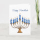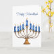 Watercolor menorah with blue burning candles on front and Star of David inside. Happy Hanukkah and greeting inside can be changed. AI assisted graphic purchased with commercial use. Artwork: CosmicMeta