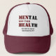 A motivational maroon and white TRUCKER CAP promoting men's mental health, and encouraging men to talk. The design shows the words MENTAL HEALTH combined with MEN WHO TALK HEAL. There is a placeholder Scripture verse based on Ecclesiastes, which is CUSTOMIZABLE, so you can personalize with your name, organization or text of your own choice. This would make a great favour giveaway or sales merchandise at men's conferences, mental health conferences, mental health overcomers and for mental health organizations, etc. Other colours available.