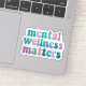 The image is a colourful sticker featuring the phrase mental wellness matters in a playful, wavy font. The text is arranged in three lines, with each word in a different colour scheme. Mental is in shades of teal and pink, wellness is in shades of teal and purple, and matters is in shades of purple, teal, and pink. The overall design is vibrant and eye-catching, emphasizing the importance of mental health and wellness.
