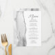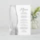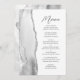 Cet élégant menu mariage moderne comprend une bordure en aquarelle gris et blanc, ornée d'une parties scintillant en faux argent. Le texte personnalisable combine le script d'écriture manuscrite gris charbon et les polices sans serif sur un arrière - plan blanc. La conception de l'agate est répétée à l'envers.