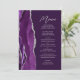 Cet élégant menu mariage moderne comprend une bordure d'aquarelle violette ornée d'une parties scintillant en faux argent. Le texte personnalisable combine écriture manuscrite gris argent et polices sans serif sur un arrière - plan de prune. Le design d'agate violet et argenté est répété à l'envers.