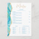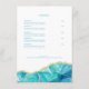 Un autre menu de restaurant élégant par Blue Sands Studio. Ce menu moderne présente un design aquarelle bleu aqua avec des détails de paillettes dorées fausses. Ressemblant à la pierre d'agate. Les polices serif classiques sont combinées avec une calligraphie élégante. Modèle facilement modifiable pour insérer vos sections de menu et vos articles. Présenté en Entrées, Plats d'accompagnement, Soupe & Salade et Dessert. Si vous avez besoin d'aide ou de conseils, veuillez m'envoyer un message Zazzle.