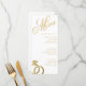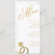 Elégant menu de réception de mariage blanc et or avec bague en diamant brillant. Personnalisez-le avec les détails de votre événement.