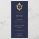 Un menu élégant à l'air vintage, à conseiller pour le baptême d'un garçon. Au-dessus du texte, il y a une croix dans une crête vintage, toutes deux en fausse feuille d'or. Le titre "Menu" et les sous-titres sont écrits en casquette. Tout le texte peut être personnalisé et a une couleur dorée semblable à la fausse crête d'or. L'arrière - plan est bleu marine. Sur le dos, il y a la même croix en crête. La crête florale vintage est issue d'une vieille reliure de couverture, du livre "Rust, Smut Mildew & Mold", de 1870, maintenant dans le domaine public.