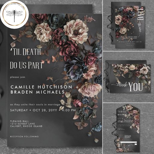 Menu Black Moody Gothic Flowers & Mist Mariage