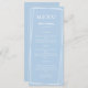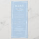 Un délicieux menu de réception de mariage en bleu clair, avec une typographie stylée pour les noms du couple. Le menu est bordé par un design géométrique aux bords, créant un effet de cadre élégant. Customisez le modèle de menu avec vos propres détails en cliquant sur le bouton Personnaliser.