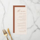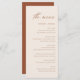 Ajoutez un accent élégant à votre paysage de table d'événements avec cette carte de menu personnalisable. Il présente un script fantaisiste et une typographie simple. Personnalisez cette carte de menu boho en ajoutant vos propres détails. Cette carte en terre cuite et blanche est parfaite pour les mariages, les douches nuptiales, les baby showers, et bien plus encore.