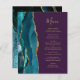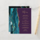 Le bord gauche de cet élégant menu mariage moderne comporte une bordure turquoise d'aquarelle bleue ornée d'une parties scintillant en faux or. Le texte personnalisable combine un script d'écriture manuscrite de couleur or et des polices de cuivre sur un arrière - plan violet. L'envers présente un design d'agate turquoise et or assorti.