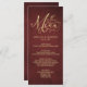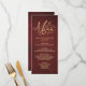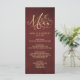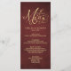 Ce menu élégant présente une typographie d'or fantaisiste sur un arrière - plan parchemin bordeaux. Vous pouvez ajouter vos détails dans le menu personnaliser. Ce menu fait partie d'une belle suite mariage assortie qui peut être entièrement personnalisée.