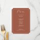 Cette carte de menu mariage en terre cuite moderne en forme de ticket présente une calligraphie moderne et une typographie contemporaine. Parfait pour un mariage moderne mais classique ou autre événement, mariage avec un thème couleur Terracotta ou mariage élégant. À l'arrière, vous avez la place pour vos noms et la date du mariage - ou simplement supprimer le texte au verso. Ce menu mariage est également disponible avec une autre police de calligraphie et une police sans serif légèrement différente pour le texte principal - regardez dans ma boutique.