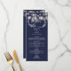 Doté de jolies lampes à cordes et d'illustrations artisanales à fleurs rustiques, personnalisez ce menu bleu marine élégant avec vos informations spéciales sur le menu du jour de mariage. Conçu par Thisisnotme©