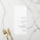 Moderne et sobre, ce menu minimaliste noir et blanc mariage est conçu pour offrir un cadre élégant et sans effort. Chaque carte présente un plan propre et simple, parfait pour en placer un à chaque siège du client. Le texte est soigneusement aligné vers le bas, laissant de l'espace en haut pour ajouter des étiquettes de nom, des joints de cire ou des accents décoratifs. Simple mais raffiné, ce design s'ajoute à tout style mariage avec sa typographie équilibrée et son élégance intemporelle.