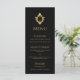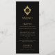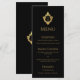Un menu élégant à l'air vintage, à recommander pour un mariage aux couleurs mariage de noir et or. Au-dessus du texte, il y a un monogramme dans une vintage fausse crête d'or. Le titre "Menu" et les sous-titres sont écrits en casquette. Tout le texte peut être personnalisé et a une couleur dorée semblable à la crête d'or. L'arrière - plan est noir. Sur le dos, il y a le même monogramme dans la crête. Le monogramme est formé par les deux initiales séparées par une fine ligne. La crête florale vintage est issue d'une vieille reliure de couverture, du livre "Rust, Smut Mildew & Mold", de 1870, maintenant dans le domaine public.