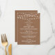 Simple mais élégant, les lampes à cordes de la collection rustique Kraft mariage est un design époustouflant avec de belles lumières à cordes blanches suspendues sur un arrière - plan à effet Kraft, qui est parfait pour toute célébration mariage rustique. Ces cartes de menu peuvent être personnalisées pour votre occasion spéciale et feraient le menu parfait pour votre mariage, douche nuptiale, fête de fiançailles, fête d'anniversaire et bien d'autres occasions spéciales. Ajoutez votre libellé personnalisé à cette conception à l'aide des cases "Modifier ce modèle de conception" situées à droite de l'élément, ou cliquez sur le bouton bleu "Customiser" pour arranger le texte, modifier les polices et les couleurs et ajouter des informations ou des images supplémentaires à cette conception. AFFICHER LES ÉLÉMENTS CORRESPONDANTS POUR CETTE COLLECTION