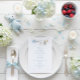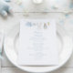 The menu features a sweet watercolor clothesline strung across the top proudly displaying tiny, adorable items, each featuring a cute bunny dressed in blue in a soft watercolor style. The back features the clothesline motif and a soft cloud. Easily add your own details and change the font style, size color and placement if you would like to. This menu is a beautiful detail, inviting your guests to share in the "hoppy" anticipation of your baby boy's arrival!