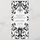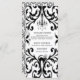 Le menu du dîner est composé d'une silhouette de lustre, de chauves-souris, d'une araignée et d'un chat noir sur un arrière - plan damassé noir et blanc. Vous pouvez personnaliser avec tous les détails de votre menu.