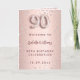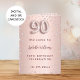 Un fond dégradé or rose faux avec des diamants roses. Le nom est écrit avec un style de lettrage à la main de couleur or rose foncé moderne. Le numéro 90 est écrit avec une police de style ballon, script. Texte de bienvenue, photo, menu et un mot de remerciement au verso.