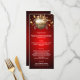 Carte de menu de dîner de fête de Noël. Personnalisez et ajoutez un nom/événement, une date et le menu. Un fond rouge, texte blanc. Décoré d'une boule dorée. Texte : Joyeux Noël